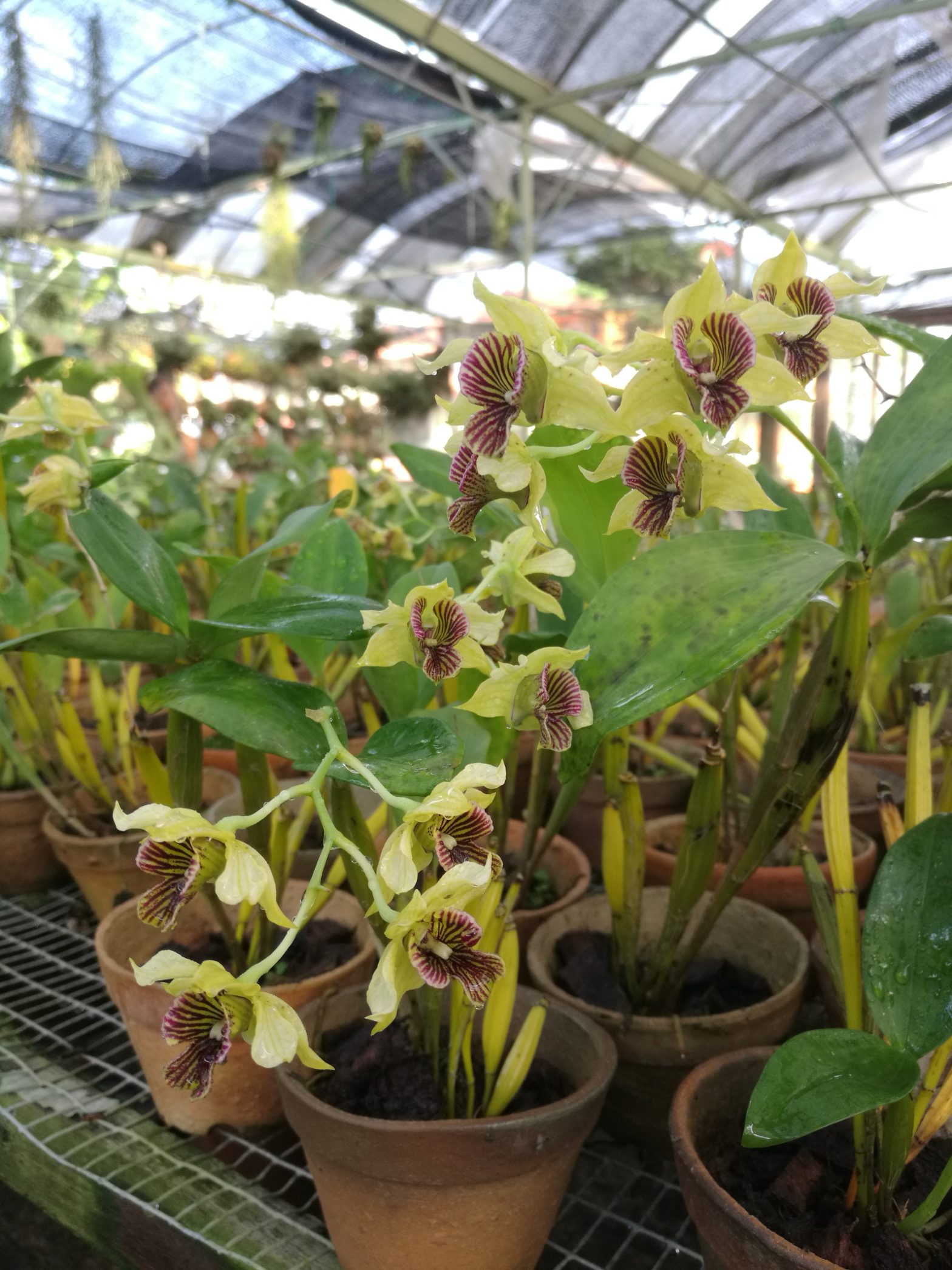 This large epiphytic and occasional lithophytic orchid is found across Asia and Australia at elevations of 150–1800m in evergreen and montane forests. It has slender, pendulous stems with deciduous, narrow leaves. Blooming mainly in winter and spring, it produces short inflorescences from older, leafless canes, each with 1–3 fragrant, short-lived flowers strongly scented of violets.… Continue reading Dendrobium aphyllum