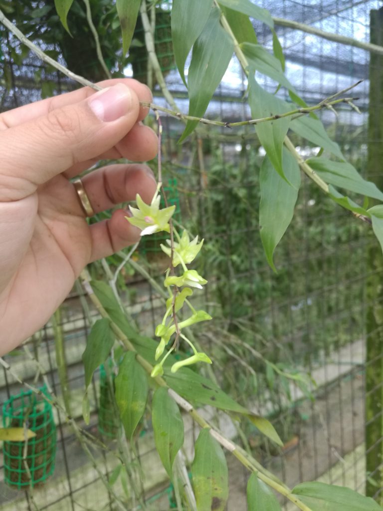 This medium-sized orchid is native to Flores Island in the Lesser Sunda Islands, growing as a hot to warm epiphyte at elevations up to 600 meters. It has erect canes with several lanceolate, acute leaves. Blooming in late spring to early summer, it produces arching to pendulous inflorescences with several to many flowers.